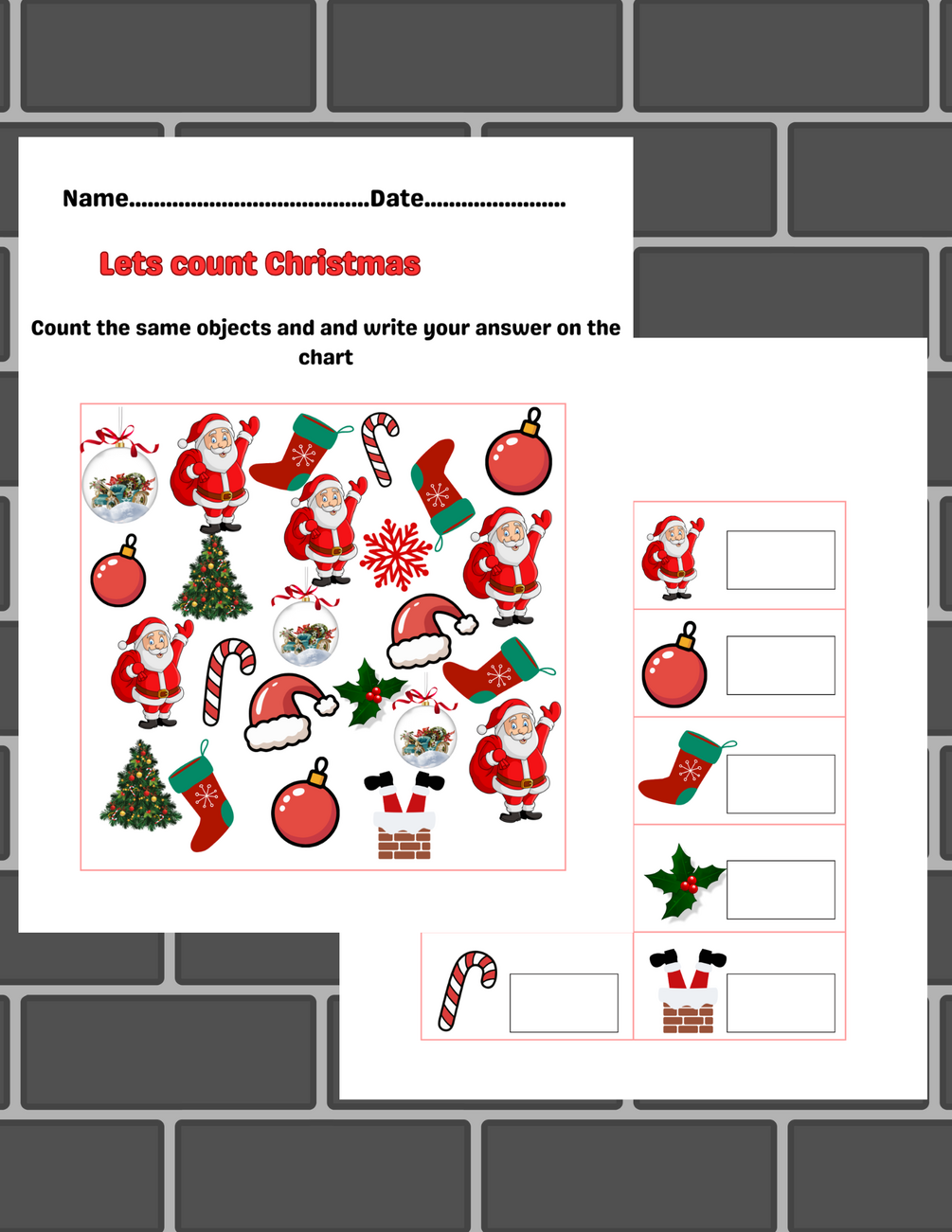 Your little learners will love spotting and counting festive holiday objects — Santa, stockings, candy canes, ornaments, and more! This hands-on counting worksheet helps children strengthen number recognition, observation, and early math skills in a fun, Christmas-themed way.