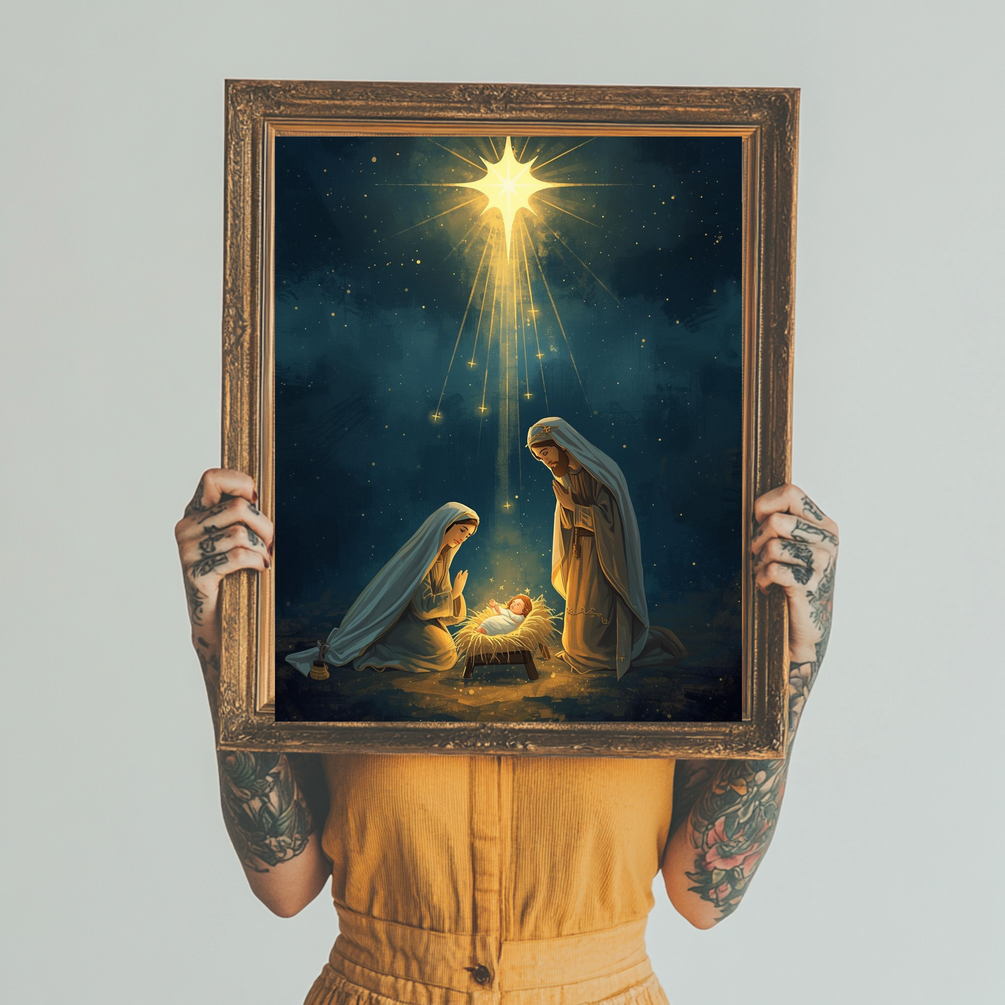 Bring the spirit of Christmas into your home with this beautiful Nativity digital print. Featuring the Holy Family (Mary, Joseph and Jesus) under the shining star, this artwork adds warmth, meaning, and elegance to your holiday décor. Perfect for living rooms, prayer spaces, churches, or as a heartfelt gift.